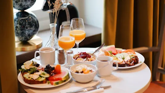 At Home Hotel, you get a delightful and cozy start to the day. Enjoy freshly baked bread, fresh cold cuts, eggs, bacon, yogurt, fruit, and, of course, a cup of freshly brewed coffee.